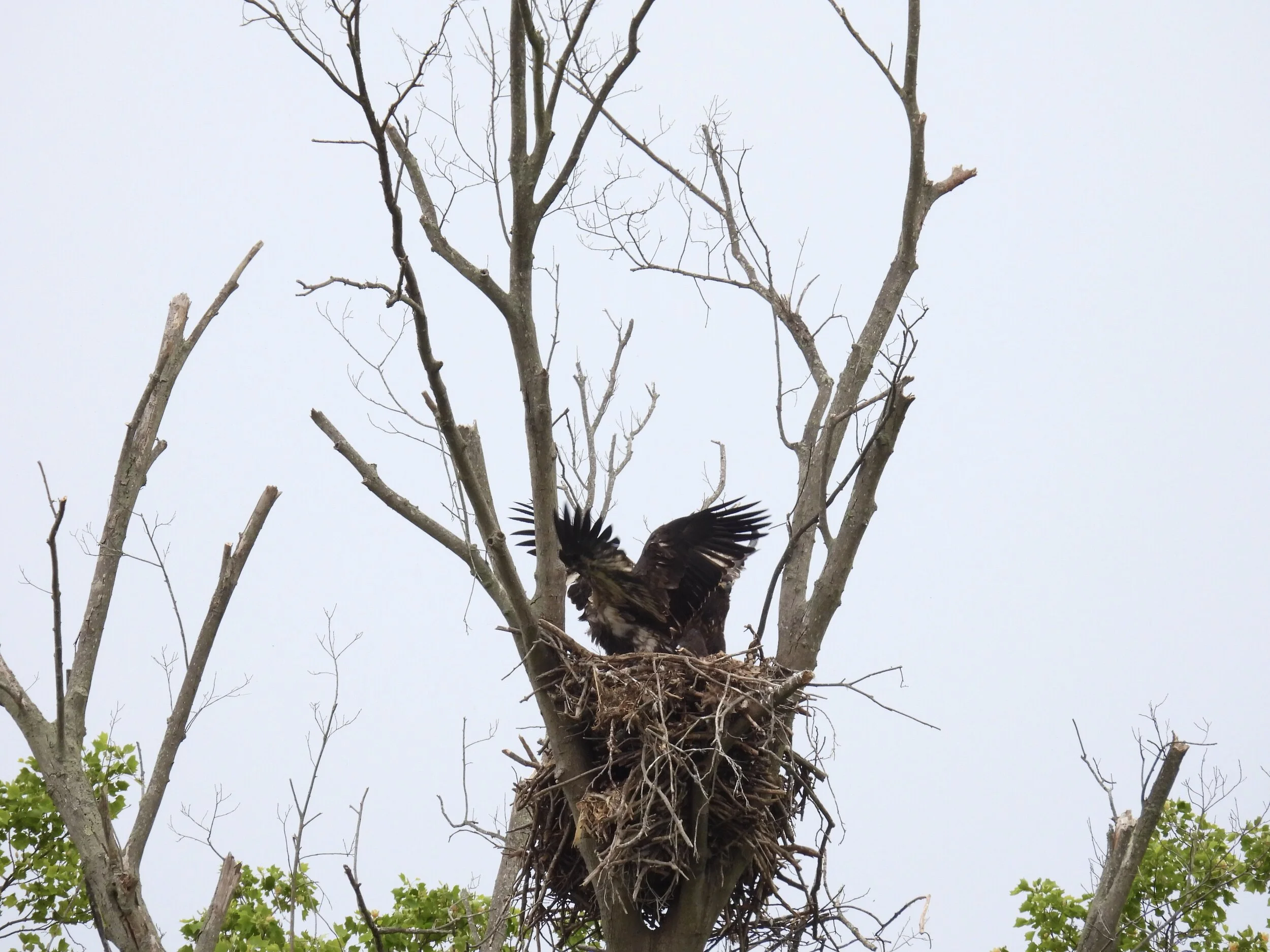 The moment had arrived, the younger eaglet was going to take its first flight. I watched it spread its wings and jump, getting up its courage. Its sibling flew off the nest a couple of times during this, always returning back to the nest. After approximately 50 minutes, my finger ready to capture the moment - the eaglet took off. His first flight was short, he then returned back where he made a not so graceful landing back onto the nest. He basically crashed into his sibling and the two temporary got tangled up. Below is a series of photos taken at takeoff and landing.